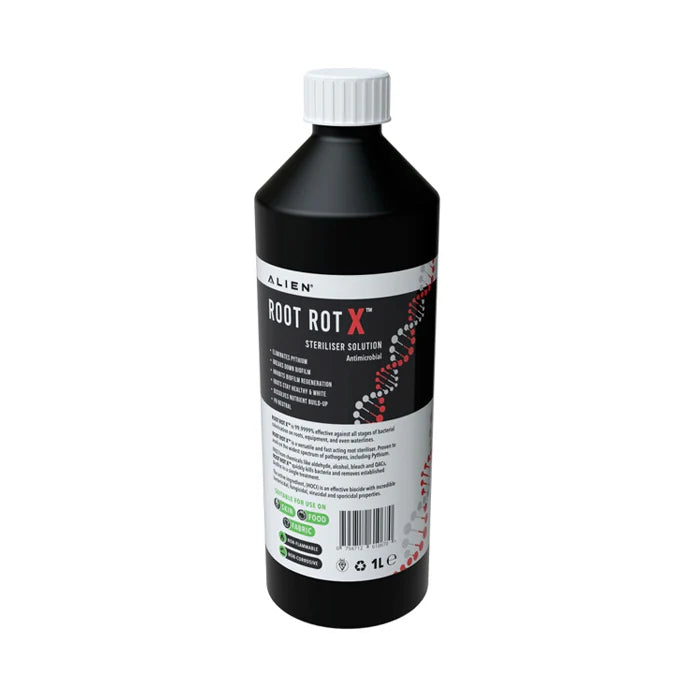 ROOT ROT X™ is a versatile and fast acting root steriliser. Proven to work on the widest spectrum of pathogens, including Pythium. FREE from chemicals like aldehyde, alcohol, bleach and QACs, ROOT ROT X™ quickly kills bacteria and removes established biofilm in a single treatment.